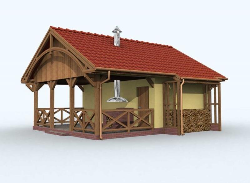 Garaż jednostanowiskowy z altaną ogrodową i składem na drewno.