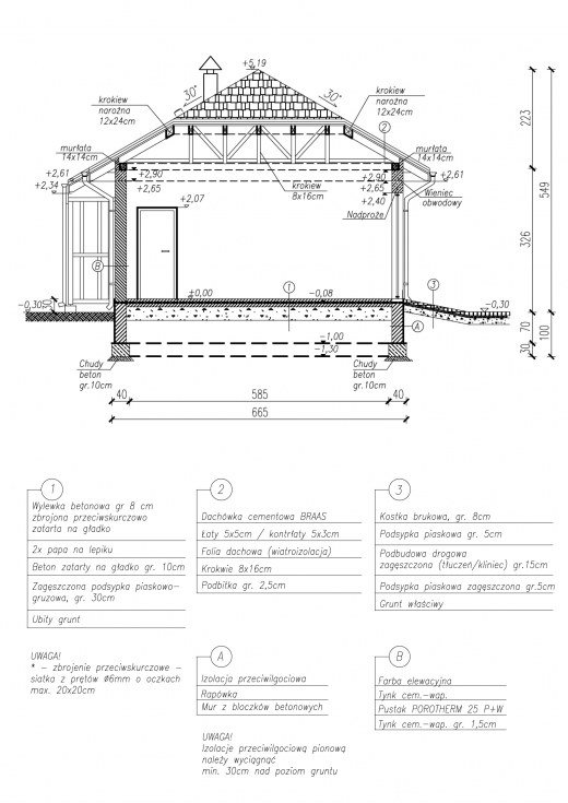 Technologia tradycyjna , ściany murowane grubości 25 cm. Konstrukcja więźby dachowej drewniana, pokrycie dachówka ceramiczna.