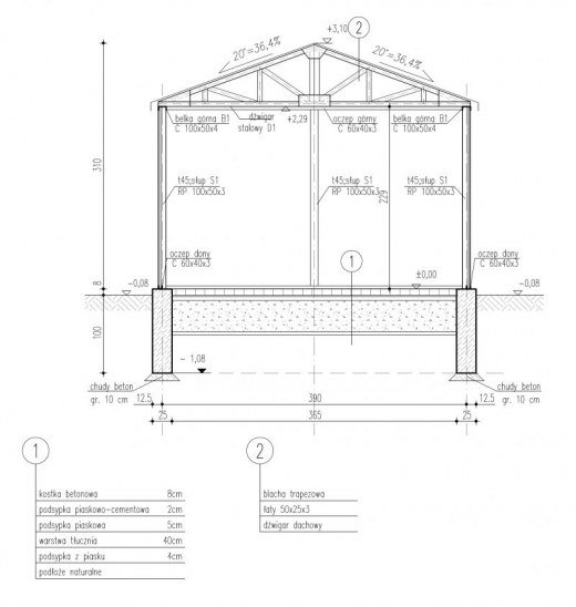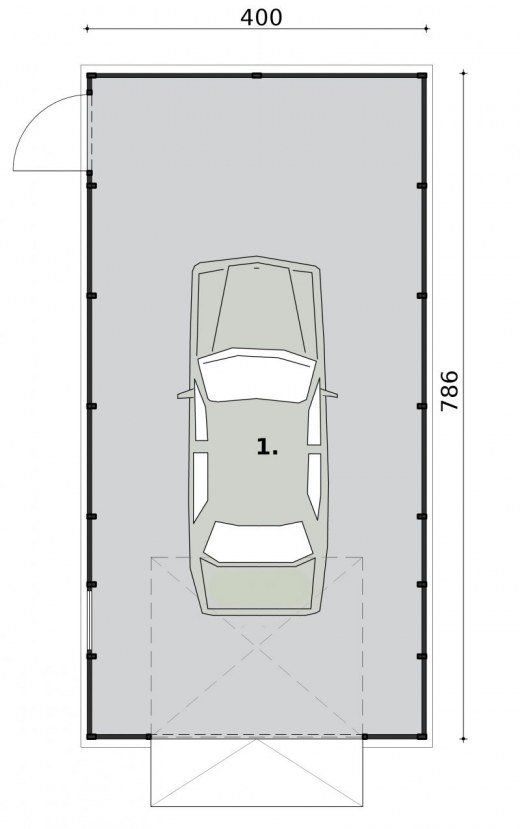 Budynek garażowy blaszany , wolnostojący , 1 stanowiskowy. Wymiary budynku : 7,86x4,00 Wymiary bram garażowych : 2,50 x 2,125 Kąt dachu : 20° Pow. dachu: 35,78m2 Projekt składa się z części architektonicznej, konstrukcyjnej i wewnętrznej instalacji elektrycznej. Do projektu dołączone są: bezpłatna zgoda na wprowadzenie zmian, oświadczenie projektantów o wykonaniu projektu zgodnie z obowiązującymi normami i przepisami oraz kserokopie uprawnień projektantów wraz z aktualnym wpisem do izby.