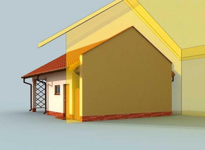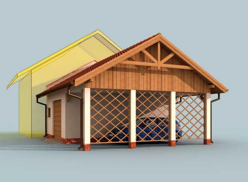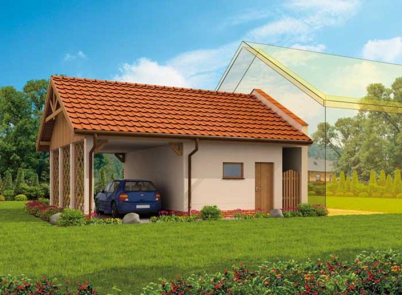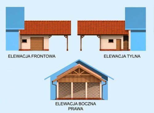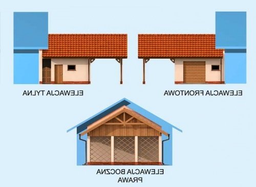 Garaż jednostanowiskowy dostawiany z pomieszczeniem gospodarczym i wiatą. Wymiar bramy wjazdowej 2400x2400. Projekt składa się z części architektonicznej, konstrukcyjnej i wewnętrznej instalacji elektrycznej. W projekcie załączone są podstawowe zestawienie stali, drewna i stolarki okienno-drzwiowej. Do projektu dołączamy bezpłatną zgodę na wprowadzenie zmian, oświadczenie projektantów o wykonaniu projektu zgodnie z obowiązującymi normami i przepisami oraz kserokopie uprawnień projektantów wraz z aktualnym wpisem do izby. W przypadku zamówienia projektu w technologii lekkiej, drewnianej konstrukcji szkieletowej, powierzchnia użytkowa budynku jest o około 7% większa.