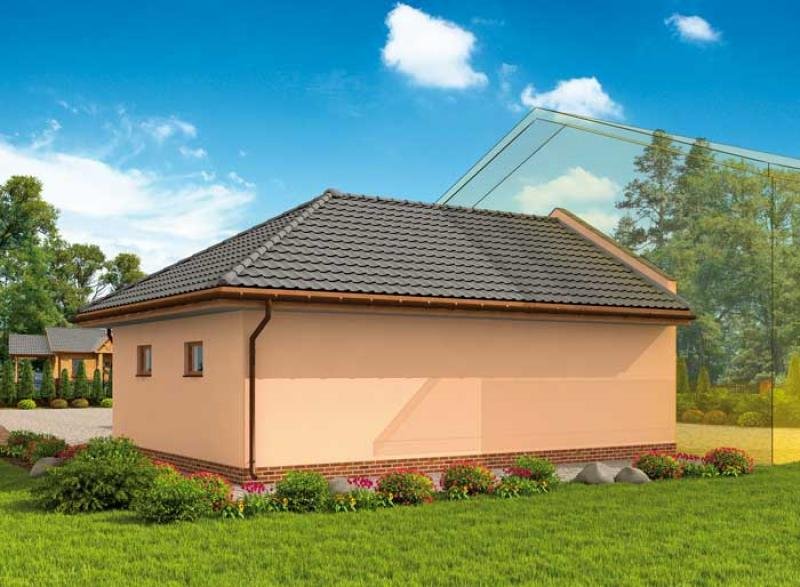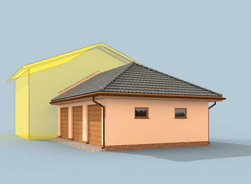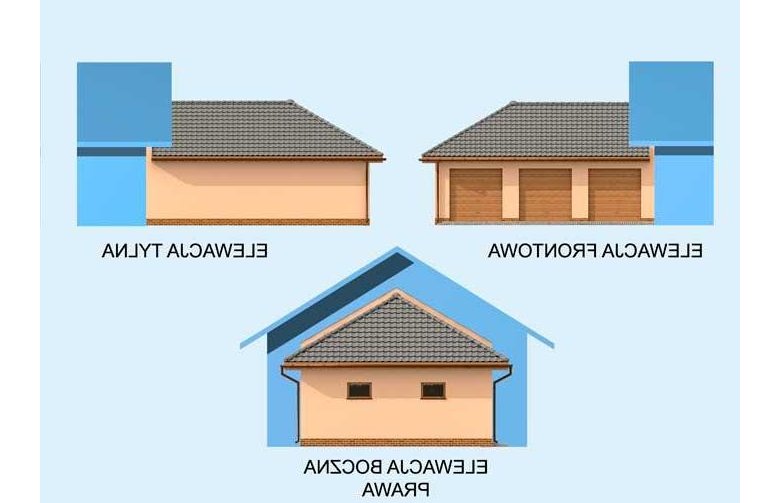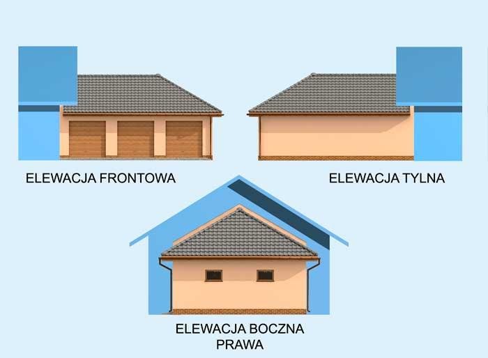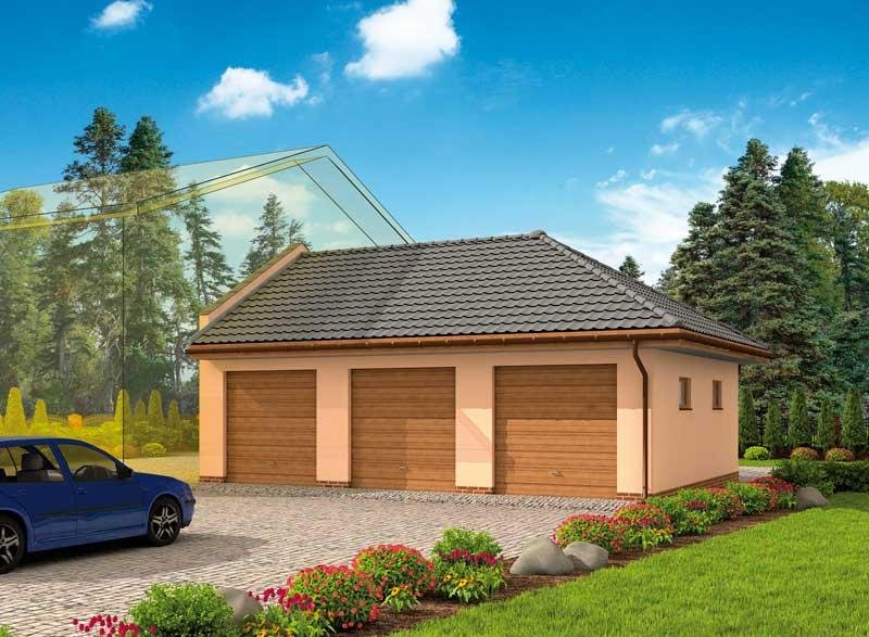 Garaż trzystanowiskowy. Wymiary bram wjazdowych 2400x2400. Projekt składa się z części architektonicznej, konstrukcyjnej i wewnętrznej instalacji elektrycznej. W projekcie załączone są podstawowe zestawienie stali, drewna i stolarki okienno-drzwiowej. Do projektu dołączamy bezpłatną zgodę na wprowadzenie zmian, oświadczenie projektantów o wykonaniu projektu zgodnie z obowiązującymi normami i przepisami oraz kserokopie uprawnień projektantów wraz z aktualnym wpisem do izby. W przypadku zamówienia projektu w technologii lekkiej, drewnianej konstrukcji szkieletowej, powierzchnia użytkowa budynku jest o około 7% większa.