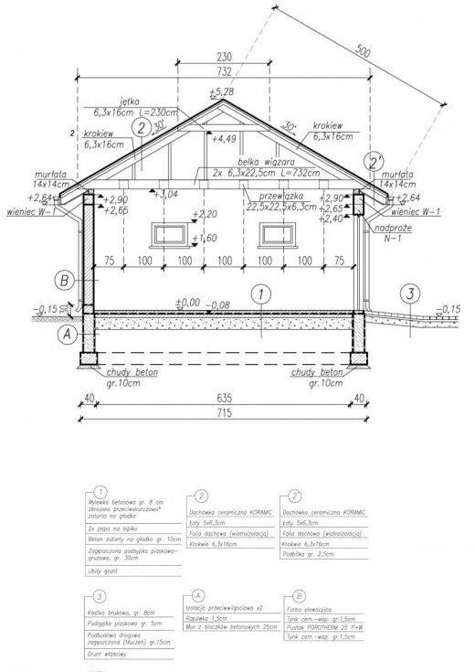 Technologia tradycyjna : - ściany zewnętrzne murowane grubości 25 cm - wszystkie ściany wykonane z pustaków ceramicznych "POROTHERM". - konstrukcja więźby dachowej drewniana, pokrycie dachówka ceramiczna. Technologia szkieletu drewnianego : - ściany zewnętrzne : słupki 4x15 rozstawione max. co 40cm obite zewnątrz płytą OSB 3 1,2cm , a wewnątrz płytą GKF 1,25cm , przestrzeń pomiędzy słupkami wypełniona wełną mineralną 15cm. - konstrukcja więźby dachowej drewniana, pokrycie dachówka ceramiczna. - docieplenie warstwą styropianu gr. 5 cm.