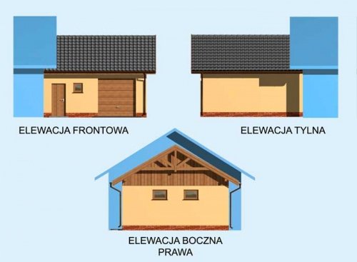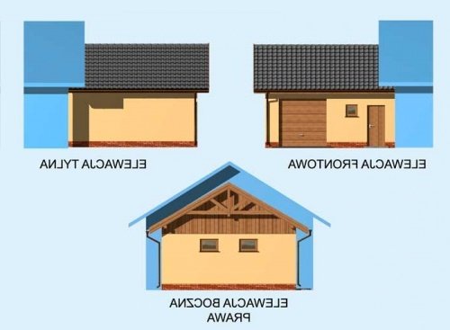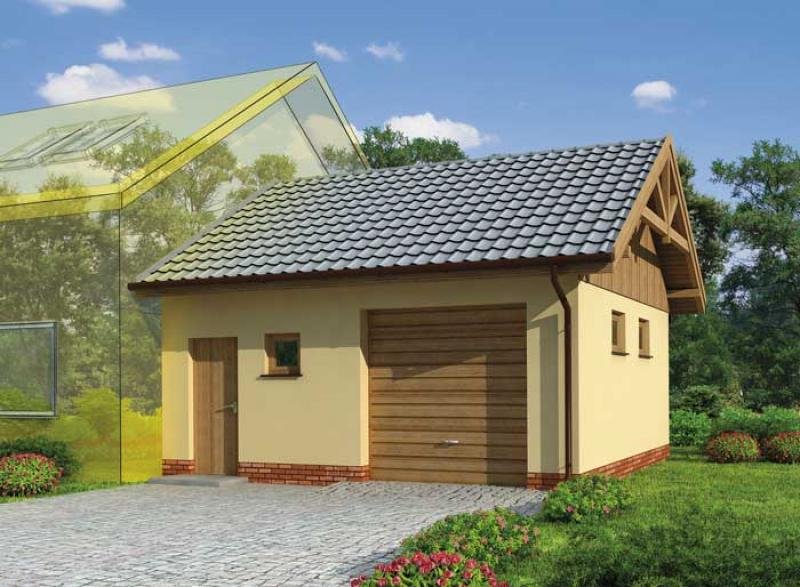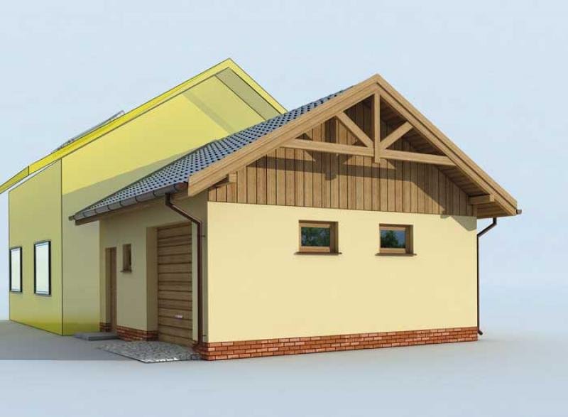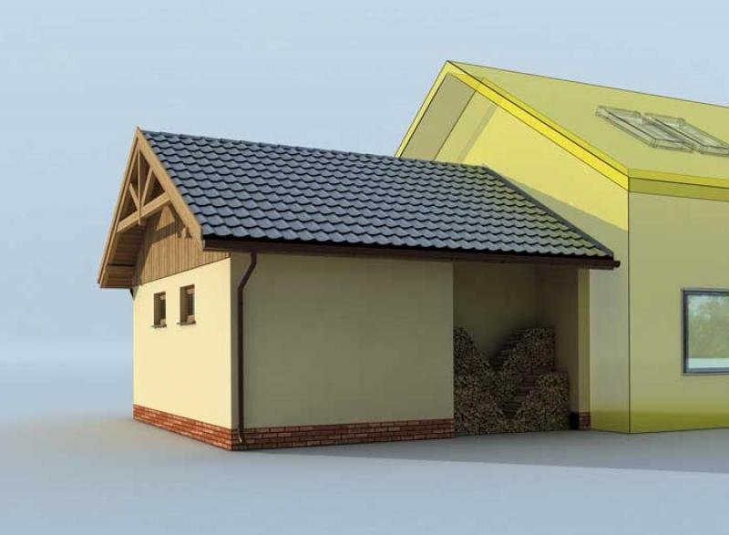 Garaż jednostanowiskowy dostawiany z pomieszczeniem gospodarczym i składem na drewno. Wymiar bramy garażowej - 2400x2400. Projekt składa się z części architektonicznej, konstrukcyjnej i wewnętrznej instalacji elektrycznej. W projekcie załączone są podstawowe zestawienie stali, drewna i stolarki okienno-drzwiowej. Do projektu dołączamy bezpłatną zgodę na wprowadzenie zmian, oświadczenie projektantów o wykonaniu projektu zgodnie z obowiązującymi normami i przepisami oraz kserokopie uprawnień projektantów wraz z aktualnym wpisem do izby. W przypadku zamówienia projektu w technologii lekkiej, drewnianej konstrukcji szkieletowej, powierzchnia użytkowa budynku jest o około 7% większa.
