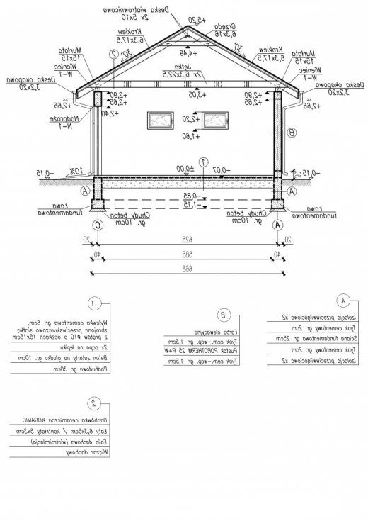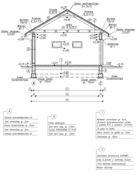 Technologia tradycyjna : - powierzchnia użytkowa - 35,12m2 - powierzchnia zabudowy - 39,19m2 - powierzchnia całoroczna - 39,19m2 - kubatura - 186,25m3 - ściany zewnętrzne nośne murowane o grubości 25cm - ściany wewnętrzne działowe murowane o grubości 12cm - wszystkie ściany wykonane z pustaków ceramicznych "POROTHERM" - wysokość budynku 5,35m - dach czterospadowy 30° - konstrukcja więźby dachowej - układ krokwiowo-jętkowy - pokrycie dachu - dachówka ceramiczna - wymiar bramy garażowej - 2400x2400