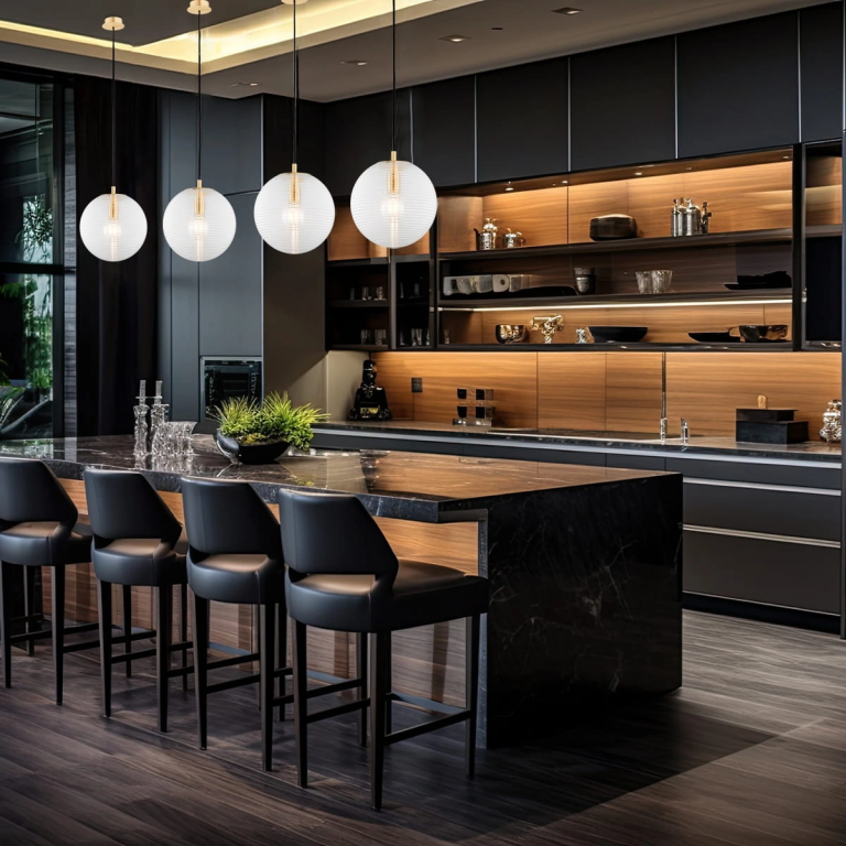 Najważniejsza jest funkcjonalność. Blaty robocze powinny być dobrze doświetlone – najlepiej sprawdzają się taśmy LED montowane pod szafkami. Nad stołem warto dodać lampę wiszącą, która podkreśli strefę jadalnianą.